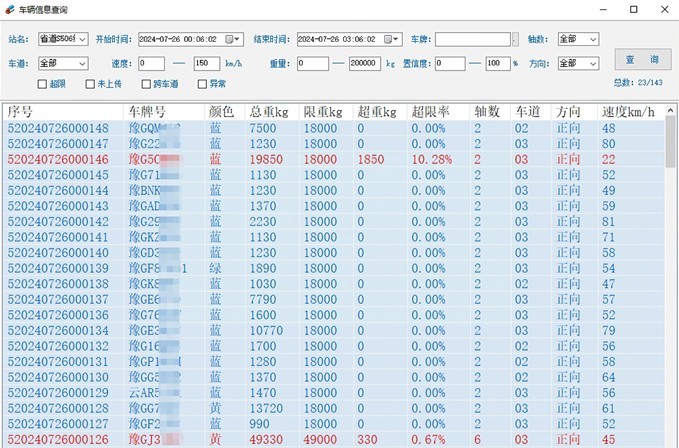 Supports queries based on lane, license plate, number of axles, weight range, speed range, confidence rate range, and other criteria within a specified timeframe.